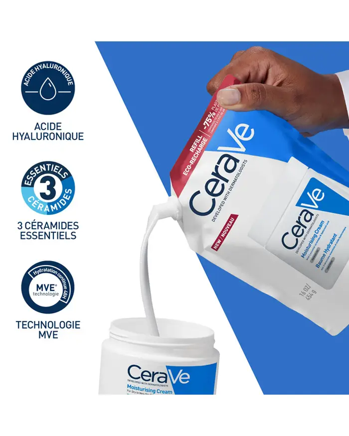 Développé avec des dermatologues, ce baume est formulé sans parfum, hypoallergénique et non comédogène. La marque indique aussi une texture non grasse, non collante et un habillage rapide. Cette version recharge permet de réduire l’utilisation de plastique, avec une indication officielle de -75 % de plastique par rapport à un pot de 454 g.