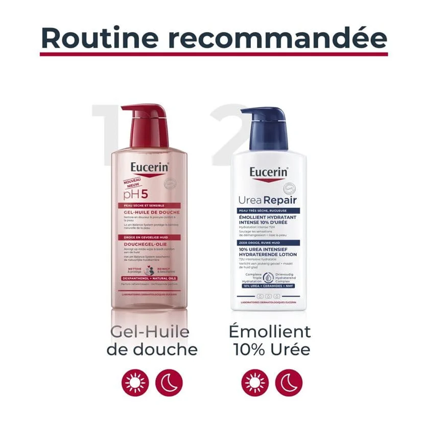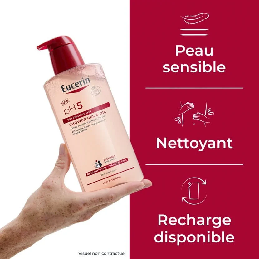 Sa formule contient du Dexpanthénol et s’inscrit dans la gamme Eucerin pH5, développée pour les peaux sèches et sensibles. La marque indique que ce soin nettoie en douceur, respecte le microbiome cutané et aide à stabiliser le pH de la peau, afin de soutenir ses défenses naturelles.