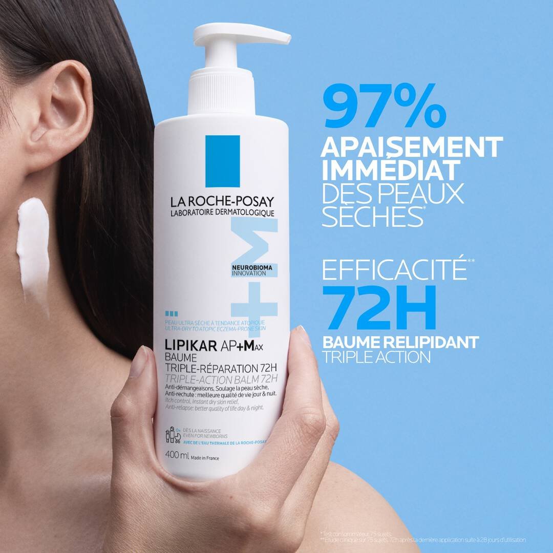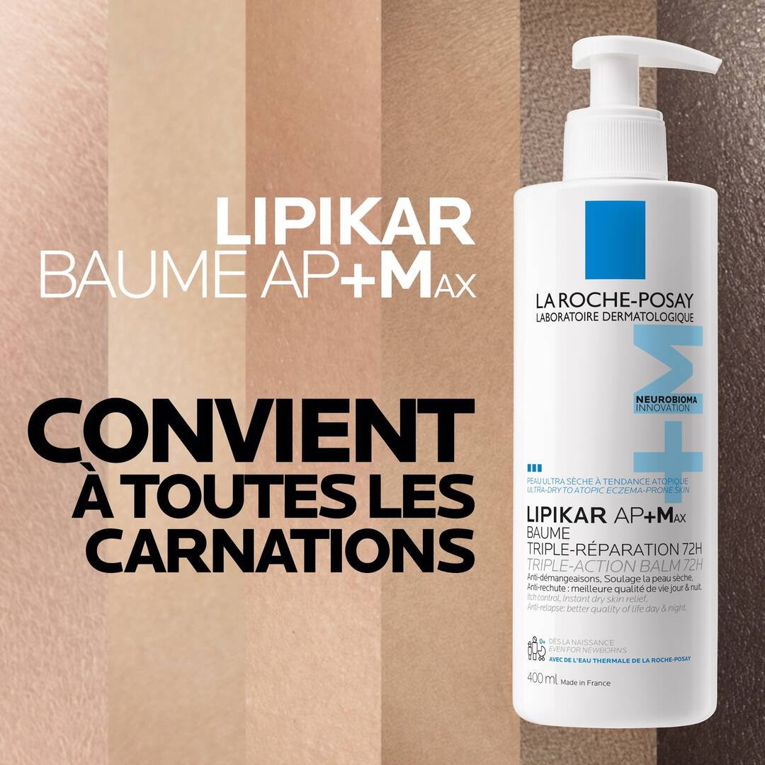 La Roche-Posay Lipikar Baume AP+MAX 400 ml est un baume relipidant triple réparation conçu pour les peaux ultra sèches à tendance atopique. Il aide à apaiser immédiatement, à réduire les démangeaisons et à restaurer durablement la barrière cutanée pour un confort longue durée.
