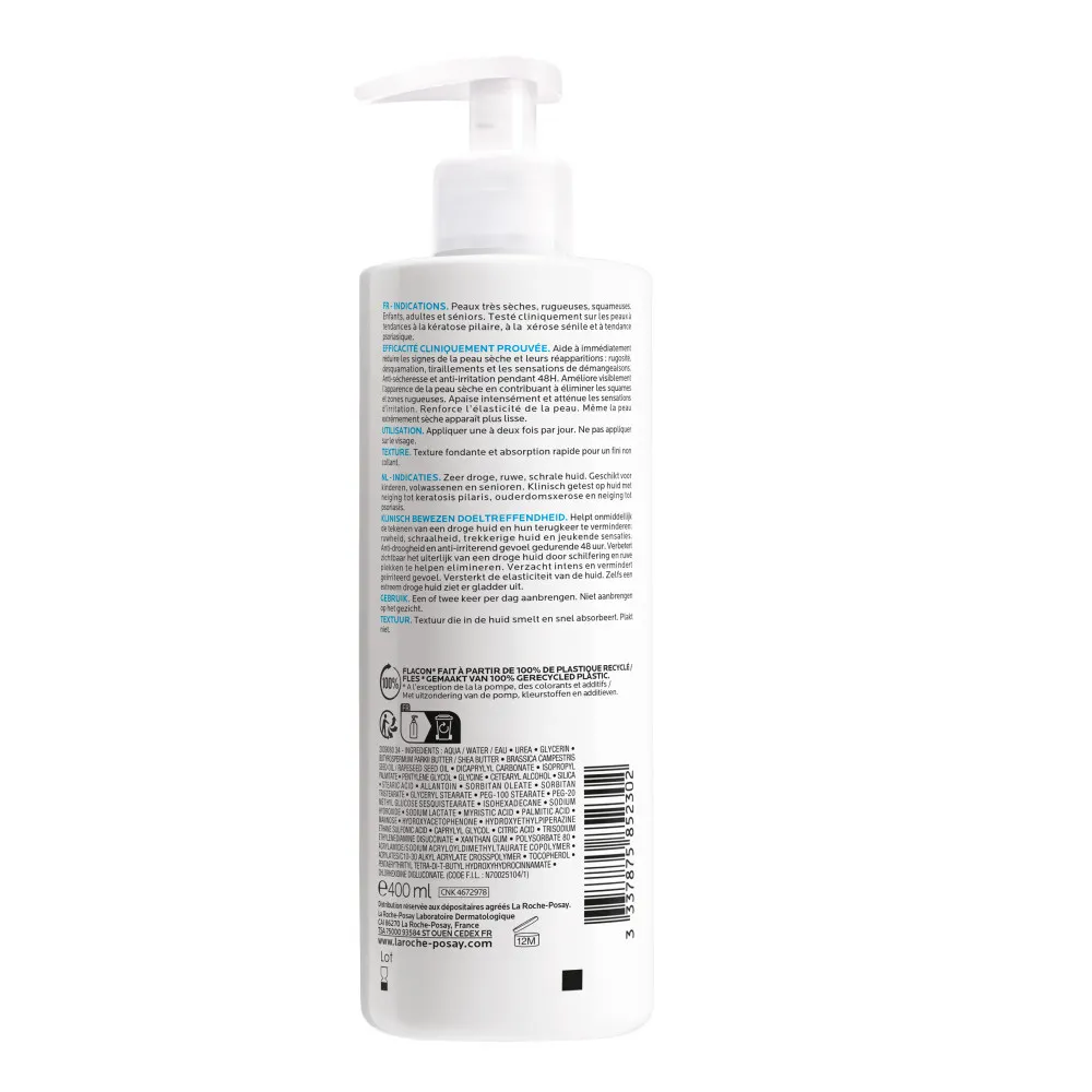 La Roche-Posay le recommande pour les peaux sujettes aux rugosités, à la desquamation, aux tiraillements et aux démangeaisons. Les sources officielles et partenaires précisent qu’il est testé cliniquement sur les peaux à tendance à la kérastose pilaire, à la xérose sénile et à tendance psoriasique.