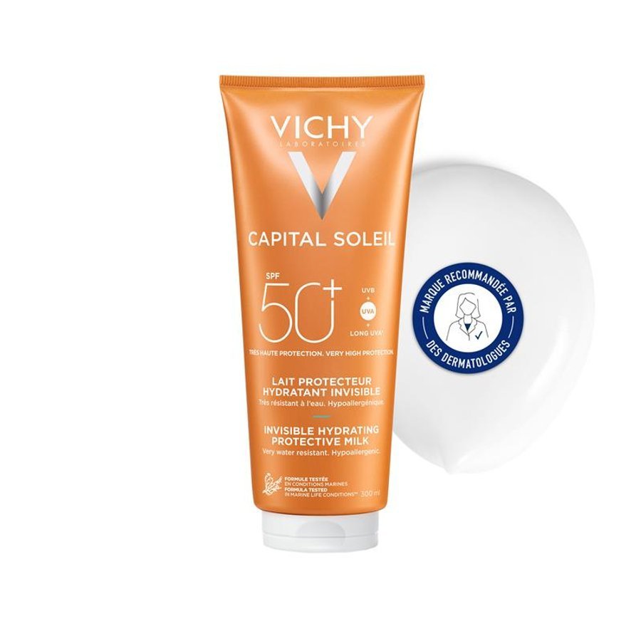 Vichy Capital Soleil Lait Solaire Fraîcheur Hydratant SPF50+ 300 ml est un lait solaire visage et corps qui offre une très haute protection contre les UVA, UVB et les UVA longs. Sa formule fluide et hydratante aide à protéger toute la famille, avec un fini invisible, sans trace blanche et sans effet gras.