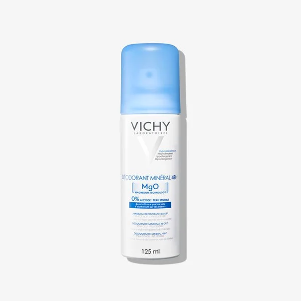 Vichy Déodorant Spray Minéral 48H 125 ml est un déodorant en aérosol conçu pour offrir une protection douce 48 heures contre les odeurs et la transpiration. Sa formule est adaptée aux peaux sensibles, sans alcool et sans sels d’aluminium.