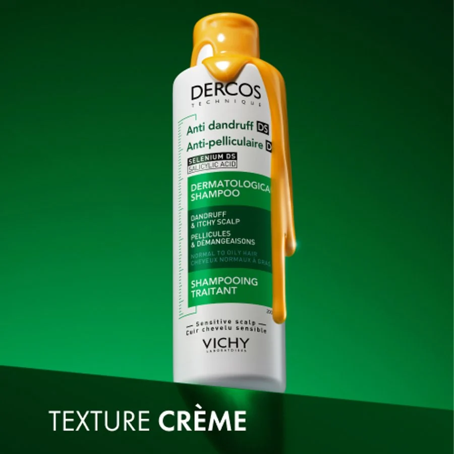 Vichy Dercos Technique Shampooing Traitant Anti-Pelliculaire DS Cheveux Normaux à Gras est un soin capillaire conçu pour les personnes sujettes aux pellicules grasses, aux démangeaisons et aux inconforts du cuir chevelu. Il convient aux cheveux normaux à gras et s’inscrit dans une routine de soin ciblée du cuir chevelu.