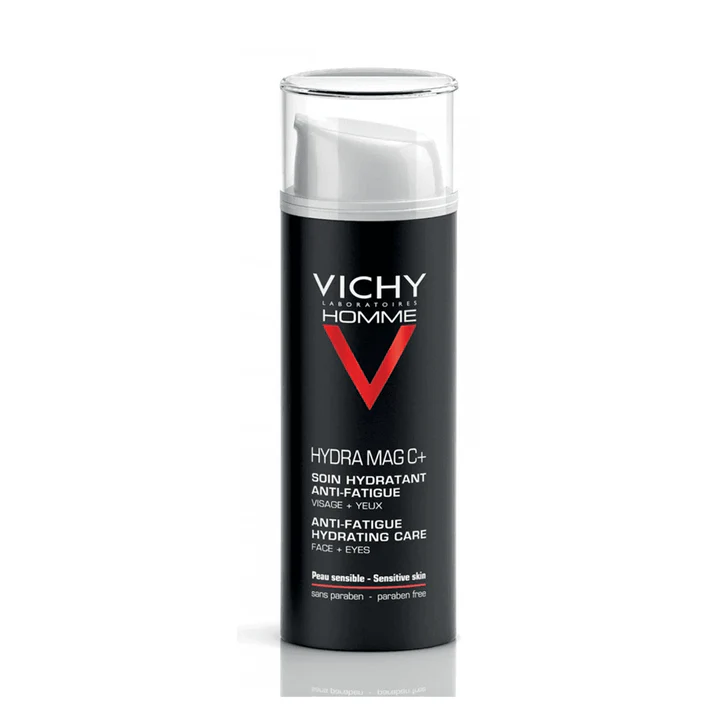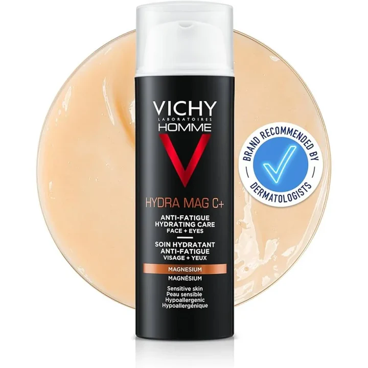 Les sources consultées décrivent un soin formulé pour les hommes à la peau sensible présentant des signes de fatigue comme la déshydratation, le teint terne, les traits tirés, les cernes et les poches. Vichy met en avant une formule enrichie en magnésium et en vitamine C, qui aide à revitaliser, renforcer et illuminer la peau. :contentReference[oaicite:1]{index=1}